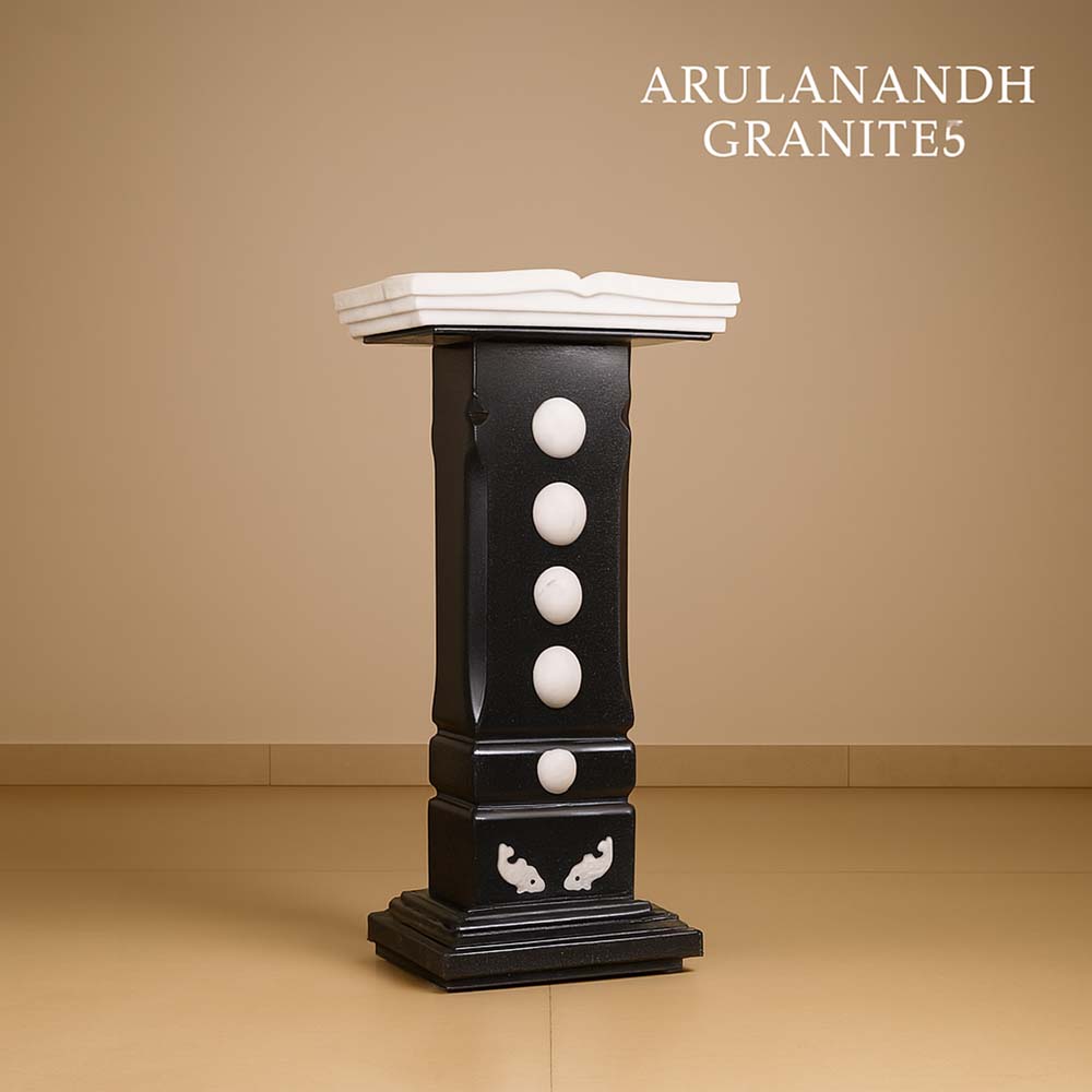 A polished granite Bible stand designed for church interiors, featuring a sculpted open-book top and decorative white inlays. The column is vertically aligned with circular accents and rests on a stepped base for stability. Ideal for altar placement or scripture display, this piece blends reverence with architectural clarity. The top resembles an open book, symbolizing the Word and offering a dignified platform for liturgical use. Crafted with contrast and precision, it serves both devotional and ceremonial functions.