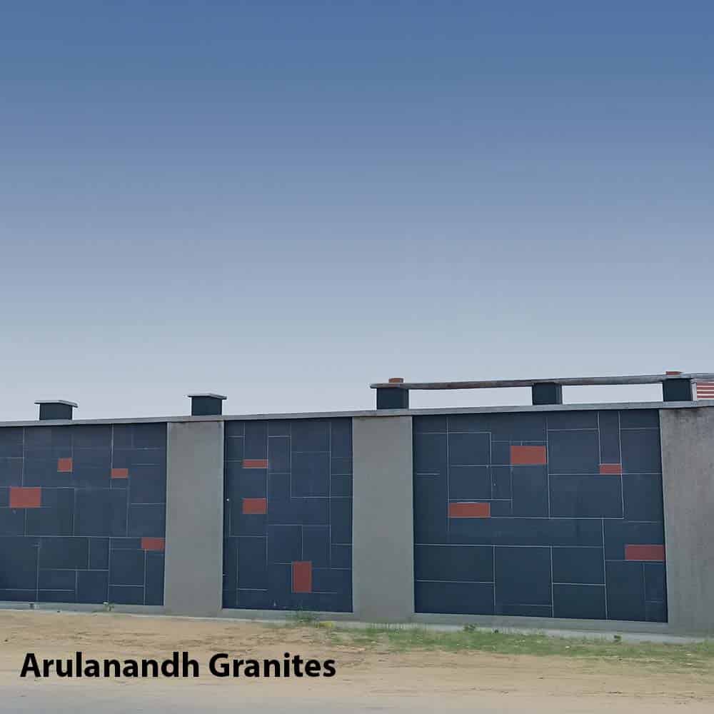 This modern granite wall installation by Arulanandh Granites showcases a bold, geometric design that blends architectural precision with visual elegance. The wall features large-format dark gray panels arranged in a clean grid layout, punctuated by asymmetrical red accent blocks that add depth and contrast to the overall composition. The top beam runs seamlessly across the wall, reinforcing its minimalist silhouette while anchoring the design. Ideal for institutional campuses, premium residential compounds, and commercial facades, this wall segment reflects Arulanandh’s commitment to legacy-grade craftsmanship, branded presentation, and enduring aesthetic clarity. Every detail — from the slab alignment to the accent placement — is executed with diagnostic precision, making this installation both a functional boundary and a statement of architectural identity. he design is fully customizable to suit site-specific dimensions, preferred finishes, and accent configurations, allowing clients to tailor the installation to their architectural vision while maintaining Arulanandh’s legacy-grade standards.